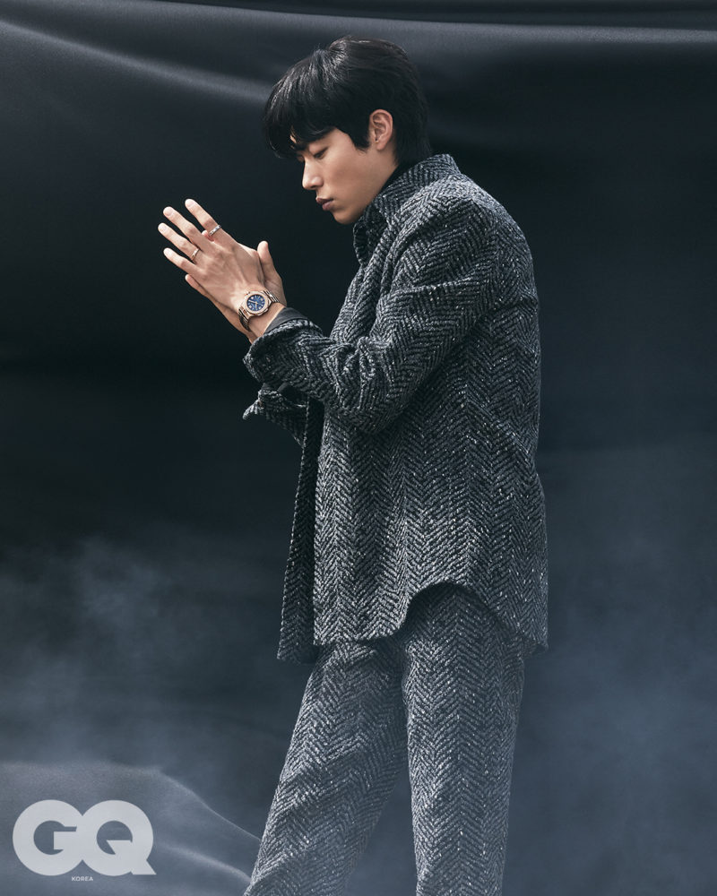 3) 우수에 찬 눈빛과 어울리는 브라운 니트를 착용한 컷에서는 혁신적인 소재인 5등급 세라믹 티타늄을 사용해 제작된 세계 최초의 여행용 시계이자 남성용 럭셔리 스포츠 시계 ‘L.U.C 타임 트래블러 원 블랙’으로 빠져드는 비주얼을 선보였다.